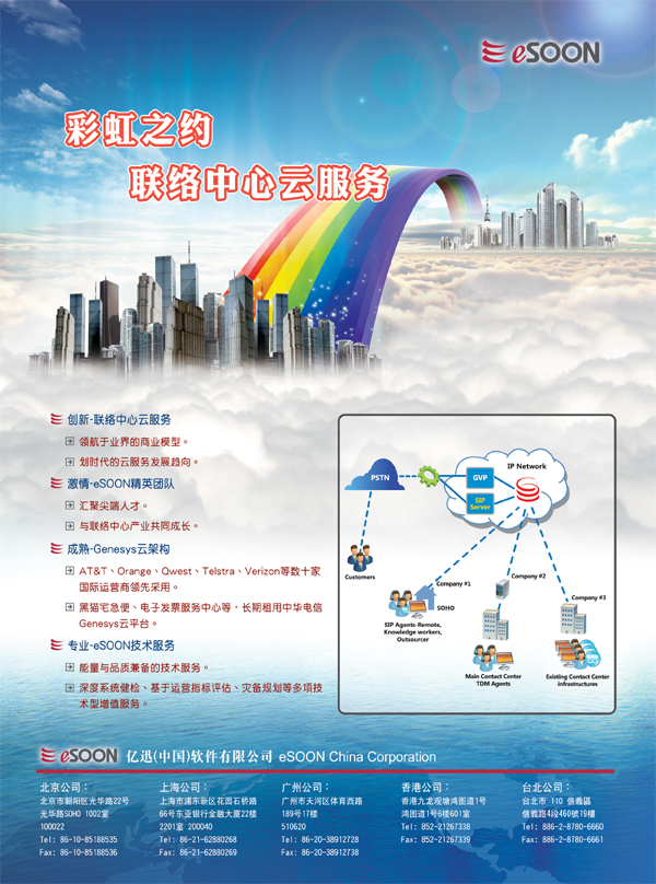 億迅(中國)軟件有限公司:"億迅(中國)軟件有限公司(eSOON)"是eSOON Cayman 集團(tuán)控股公司與eSOON BVI投資營運(yùn)公司在中國大陸投資的全資子公司,也是其拓展大中國區(qū)業(yè)務(wù)的據(jù)點(diǎn)。自2001年在上海成立至今,已在全國各地14個城市設(shè)有分公司或辦事處,為超過350家的客戶提供本地化的呼叫中心系統(tǒng)建設(shè)和運(yùn)營管理的專業(yè)服務(wù),其中不乏橫跨各個領(lǐng)域的頂尖企業(yè)。億迅一直秉承客戶至上的服務(wù)精神融入企業(yè)的業(yè)務(wù)發(fā)展和日常經(jīng)營中。