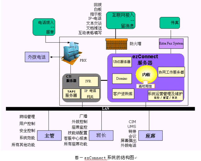 ezConnect系統(tǒng)是由訊泰信息科技公司的北京研發(fā)中心設(shè)計(jì)開(kāi)發(fā)出來(lái)的一個(gè)成熟的多媒體呼叫中心產(chǎn)品。支持傳統(tǒng)電話(huà)、web、電子郵件、傳真、語(yǔ)音郵件、IP電話(huà)、短消息、WAP等用戶(hù)接入方式;對(duì)客戶(hù)請(qǐng)求采用基于座席技能的智能分派;提供文本交談、白板共享、協(xié)同填表、文檔推送、IP電話(huà)、短消息發(fā)送等多種實(shí)時(shí)交流工具;有非常實(shí)用的實(shí)時(shí)監(jiān)控和報(bào)表子系統(tǒng)。核心部分的設(shè)計(jì)采用分離分層的思想,實(shí)現(xiàn)了相對(duì)于PBX、IVR、CRM的透明性。系統(tǒng)的配置非常靈活,可以在很短的時(shí)間內(nèi)完全改變整個(gè)客戶(hù)端的風(fēng)格,或支持一種新的語(yǔ)言。整個(gè)系統(tǒng)建立在Java平臺(tái)上,具有良好的可移植性。下面是ezConnect系統(tǒng)的結(jié)構(gòu)圖: