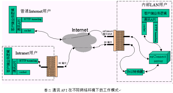 對(duì)于被企業(yè)防火墻所限制的Intranet用戶(hù),情況略微復(fù)雜一些。如果企業(yè)防火墻已開(kāi)放ezConnect的協(xié)議端口2624,那么此類(lèi)Intranet用戶(hù)訪問(wèn)ezConnect系統(tǒng)的情況與普通Internet用戶(hù)沒(méi)有區(qū)別。如果企業(yè)防火墻限制ezConnect的協(xié)議端口,但允許HTTP協(xié)議通過(guò),那么上文中提到的API會(huì)自動(dòng)選用HTTP隧道的通信方式來(lái)維護(hù)客戶(hù)端軟件與服務(wù)器軟件之間的連接。此時(shí),通信的效率會(huì)相對(duì)低一些,但對(duì)于可以透明地、完整地獲取Internet呼叫中心服務(wù)(文本交談、白板共享、IP電話(huà)等)的Intranet用戶(hù)來(lái)講是完全可以接受的。如果企業(yè)防火墻同時(shí)禁止ezConnect的協(xié)議端口2624和HTTP協(xié)議的默認(rèn)端口80,Intranet用戶(hù)將無(wú)法訪問(wèn)ezConnect系統(tǒng)。而事實(shí)上,嚴(yán)格到不允許HTTP協(xié)議通過(guò)的防火墻是非常少見(jiàn)的,因此目標(biāo)4也不成為問(wèn)題。