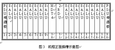 見圖2和3,遠端模塊采用19英寸標準機框,高度為5U,可安裝在各種標準的19英寸的機柜中。機框共20個插槽,正面插板,反面背板出線。每個機框可插20塊各種類型的板件,其中兩邊第1第20槽固定插電源板PSU,中間第10號槽固定插數(shù)字中繼接口板HDT4,其余16個槽為通用槽口,可插16塊各種類型接口板。每塊板為8路,一個機框總共128話路。調度接口板2RDU固定插第11槽,該板不占機框端口。對于自帶交換系統(tǒng),需要安裝一塊系統(tǒng)信號音板8TDU,該板固定插19槽,占8個端口。