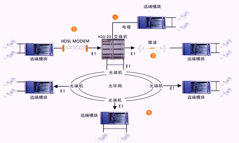 遠端模塊通過標準2M(E1)接口與交換機連接。該接口不受傳輸距離和傳輸設備的限制。常用的傳輸設備有SDH、PDH光端機(光纜),數(shù)字微波、數(shù)字擴頻,HDSL調制解調器(雙絞線)等。