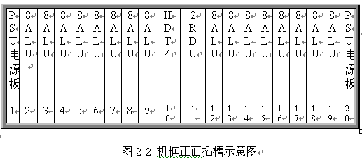 見圖 2 和 3 ,遠(yuǎn)端模塊采用 19 英寸標(biāo)準(zhǔn)機(jī)框,高度為 5U ,可安裝在各種標(biāo)準(zhǔn)的 19 英寸的機(jī)柜中。機(jī)框共 20 個(gè)插槽,正面插板,反面背板出線。每個(gè)機(jī)框可插 20 塊各種類型的板件,其中兩邊第 1 第 20 槽固定插電源板 PSU ,中間第 10 號(hào)槽固定插數(shù)字中繼接口板 HDT4 ,其余 16 個(gè)槽為通用槽口,可插 16 塊各種類型接口板。每塊板為 8 路,一個(gè)機(jī)框總共 128 話路。調(diào)度接口板 2RDU 固定插第 11 槽,該板不占機(jī)框端口。對(duì)于自帶交換系統(tǒng),需要安裝一塊系統(tǒng)信號(hào)音板 8TDU ,該板固定插 19 槽,占 8 個(gè)端口。