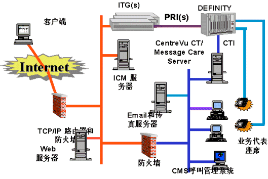 Internet呼叫中心(Internet Call Center簡稱ICC)是當前的一個明顯趨勢。支持因特網(wǎng)作為呼叫中心的訪問渠道會極大增強呼叫中心的可用性。Internet用戶可以通過主頁瀏覽、電子郵件、在線Chat、IP語音電話等方式與話務(wù)員建立在線聯(lián)系,得到優(yōu)質(zhì)的服務(wù)。AVAYA的Internet呼叫中心解決方案支持用戶采用一條電話線進行因特網(wǎng)和IP電話的訪問,ICM管理器與Web服務(wù)器建立連接,將到來的IP呼叫進行自動分配,ITG IP電話網(wǎng)關(guān)實現(xiàn)將IP語音流轉(zhuǎn)換成語音信號,經(jīng)E1線送到Definity交換機后傳到話務(wù)員座席。座席和用戶可實現(xiàn)瀏覽器同步等功能。