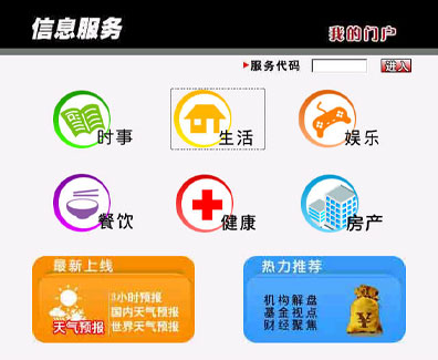 在上海IPTV提供的業(yè)務(wù)中,信息服務(wù)也是眾多用戶喜聞樂(lè)見(jiàn)的一項(xiàng)業(yè)務(wù),內(nèi)容覆蓋廣泛。它提供了時(shí)事、生活、娛樂(lè)、餐飲、健康、房產(chǎn)等信息,其中“時(shí)事”一欄呈現(xiàn)了新浪上海熱線實(shí)時(shí)傳遞的全球最新新聞資訊,讓老百姓“手握遙控器,便知天下事”,“健康”一欄更是一網(wǎng)打盡上海地區(qū)醫(yī)療機(jī)構(gòu)的信息資訊,特色?扑阉鳛橛脩籼峁┍憬莸尼t(yī)療信息服務(wù),“房產(chǎn)”中上海地區(qū)各類二手房產(chǎn)訊息一應(yīng)俱全,價(jià)格、地段、房型等應(yīng)有盡有。