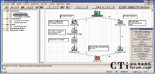 呼叫中心測試的第一步就是要創(chuàng)建要被測試的業(yè)務的呼叫流程圖?梢酝ㄟ^一個含有標準呼叫流程圖標庫的呼叫流程圖形編輯器創(chuàng)建呼叫流程圖。每個呼叫流程的圖標都包含一段Hammer
