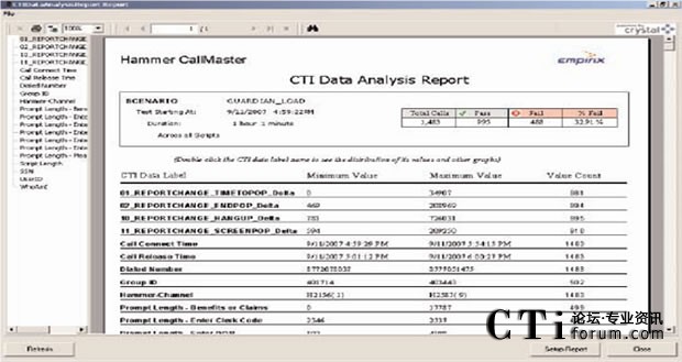 如果響應時間超過設定的預置值(閥值),或者發(fā)現(xiàn)任何其它問題時,Hammer可以把這個錯誤和它的位置記錄在數(shù)據(jù)庫中,然后實時顯示測試結(jié)果。Hammer可以模擬呼叫流程中的任何一個方面,包括DTMF按鍵音可變信息的記錄或者是為測試支持語音識別系統(tǒng)而播放大量的語音文件。Hammer專利的語音提示識別能力更可以自動檢驗在IVR和ACD/PBX系統(tǒng)中是否正確播放語音提示。