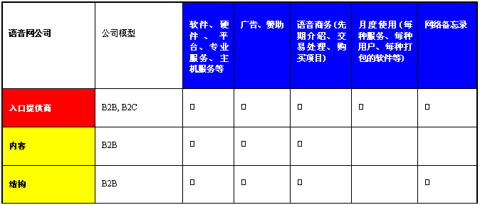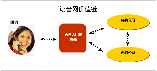 許多語音入口提供商向個(gè)人和公司提供語音網(wǎng)上的服務(wù),而內(nèi)容和結(jié)構(gòu)公司則向這些入口提供商提供技術(shù)支持、產(chǎn)品和主機(jī)服務(wù)。