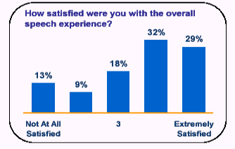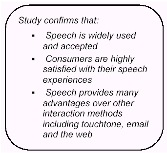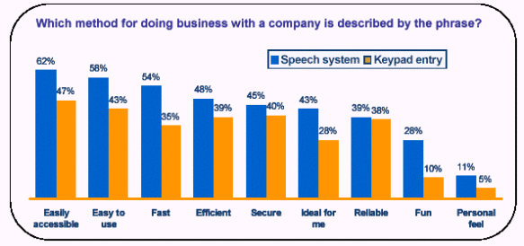 此外,十個人中九個人認為他們從使用語音服務(wù)中得到了在鍵盤式服務(wù)中得不到的價值不菲的好處,并有70%的人說如果語音服務(wù)系統(tǒng)取代了按鍵式系統(tǒng)的話,他們的效率也將得以提高。