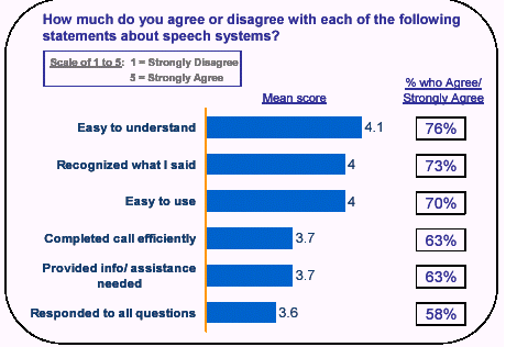 被訪問者們例舉了語音系統(tǒng)的很多優(yōu)點。超過75%的人認為語音服務(wù)方便易用,有三分之二的使用者說語音服務(wù)不僅為他們提供了準確的信息同時也為他們節(jié)省了等待客戶服務(wù)員的時間。