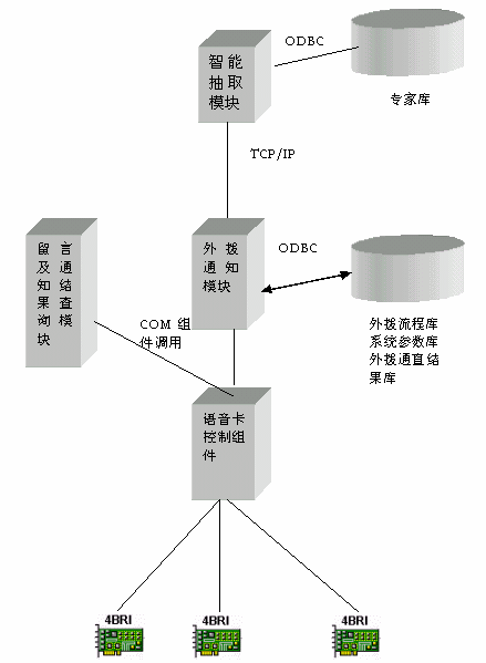 北京市建筑市場(chǎng)專家評(píng)標(biāo)抽取通知系統(tǒng)是靈訊科技有限公司采用加拿大Eicon網(wǎng)絡(luò)公司的Diva Server 4BRI 卡開發(fā)的一套高效的外撥通知系統(tǒng),該系統(tǒng)充分體現(xiàn)了Eicon網(wǎng)絡(luò)公司 Diva Server 4BRI卡強(qiáng)大的語音功能以及系統(tǒng)的穩(wěn)定性,準(zhǔn)確地識(shí)別了外撥手機(jī)的遇忙、無人、不再服務(wù)區(qū)、關(guān)機(jī)、空號(hào)等狀態(tài),實(shí)現(xiàn)了對(duì)手機(jī)狀態(tài)的全面監(jiān)控,全面解決了模擬語音卡對(duì)外撥手機(jī)信號(hào)無法判斷的問題。具體的系統(tǒng)架構(gòu)如下:![]()