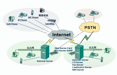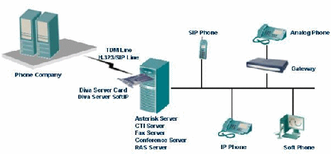 Asterisk IP PBX與Diva Server結(jié)合就能夠?qū)崿F(xiàn)IP PBX與呼叫中心完美結(jié)合的一體化解決方案,該方案結(jié)合了IP網(wǎng)的靈活性及Eicon