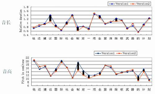 MSRA的研究人員發(fā)現(xiàn):兩遍錄音的整體音高分布是相當(dāng)一致的。但是,如果比較兩遍錄音中相應(yīng)單元的音高,也會(huì)看到明顯的差異。也就是說,雖然受到特定的上下文和語義表達(dá)的約束,音段音高的取值也有相當(dāng)大的變化范圍,其可變范圍可以大到所有音段的整體變化范圍的45%左右。