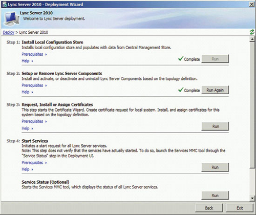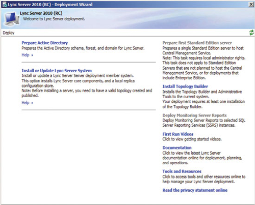 準(zhǔn)備好基礎(chǔ)結(jié)構(gòu)并發(fā)布拓?fù)浜,即可開始安裝前端服務(wù)器和服務(wù)器角色,以啟用 A/V 會(huì)議、企業(yè)語音、監(jiān)控、存檔及其他功能。準(zhǔn)備每臺(tái)服務(wù)器從運(yùn)行部署向?qū)В▍⒁妶D 3)開始,但每個(gè)服務(wù)器角色都有自己的安裝和配置要求。您可以在 TechNet 庫的“部署 Lync Server 2010 Standard Edition”部分查找更多詳細(xì)信息。