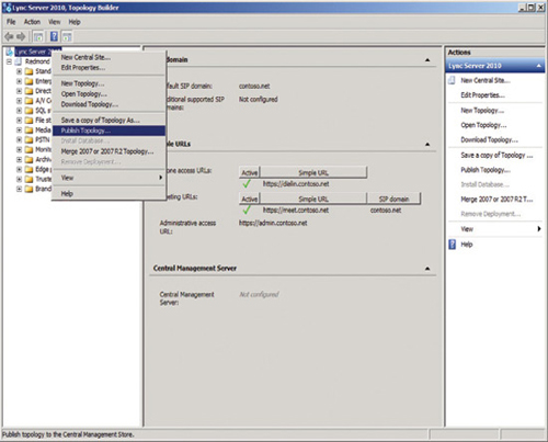 感到滿意后,可使用拓?fù)渖善鱽眚?yàn)證拓?fù)。如果它作為有效拓(fù)渫ㄟ^驗(yàn)證,則可以發(fā)布。發(fā)布拓?fù)鋾r(shí),Lync Server 會(huì)將拓?fù)浯嫒胫醒牍芾泶鎯?chǔ)。如果尚未創(chuàng)建中央管理存儲(chǔ),Lync 會(huì)在您提供有效拓?fù)洳?zhǔn)備發(fā)布拓?fù)鋾r(shí)創(chuàng)建中央管理存儲(chǔ)。在所處環(huán)境的各臺(tái)服務(wù)器上安裝 Lync Server 時(shí),服務(wù)器會(huì)從中央管理存儲(chǔ)讀取拓?fù),并安裝自身以配合其在您的部署中的角色。