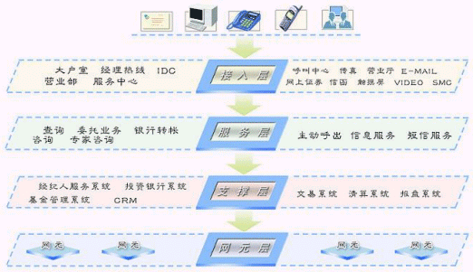 證券客戶服務系統(tǒng)面向用戶提供電話、傳真、網(wǎng)絡(luò)等方式的咨詢、查詢、委托、銀行轉(zhuǎn)帳、自動業(yè)務等業(yè)務功能。系統(tǒng)以提供“個性化、社會化、信息化”服務為重要特征,具有“滿足未來業(yè)務發(fā)展需要”、“滿足實時處理”的能力。系統(tǒng)在設(shè)計、實現(xiàn)上,以具有先進技術(shù)和高穩(wěn)定性的呼叫中心平臺為基礎(chǔ),竭力為證券業(yè)務運營商建立一個強大、開放、靈活的業(yè)務服務系統(tǒng),更好地滿足證券用戶日益增長的各種新的服務需求,保持證券企業(yè)在市場競爭中的優(yōu)勢。
