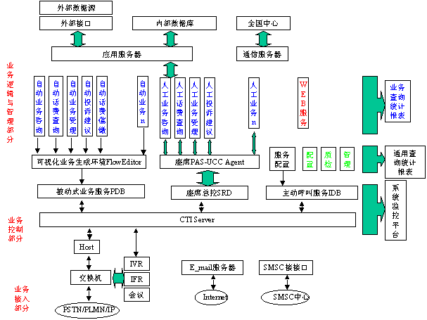 平臺部分完成系統(tǒng)的基本服務(wù)處理,不針對具體的服務(wù)業(yè)務(wù),提供電話接入、呼叫控制、人工/自動服務(wù)、e_mail服務(wù)、WEB服務(wù)、SMSC服務(wù)等的基礎(chǔ)環(huán)境。業(yè)務(wù)部分完成系統(tǒng)的業(yè)務(wù)描述,按照平臺的業(yè)務(wù)接口,針對聯(lián)通1001客戶服務(wù)的每一個具體業(yè)務(wù)需要,開發(fā)相應(yīng)的服務(wù)業(yè)務(wù)功能模塊或流程,實(shí)現(xiàn)系統(tǒng)的服務(wù)業(yè)務(wù)。業(yè)務(wù)部分完全建立在PAS-UCC平臺之上。