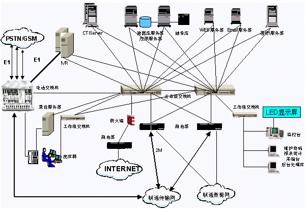 用戶撥打聯(lián)通客戶服務(wù)系統(tǒng)特服號碼1001,呼叫經(jīng)過電話網(wǎng)絡(luò)匯接到省中心匯接局,然后接入本系統(tǒng)。本系統(tǒng)的呼叫匯接采用《中國聯(lián)通客戶服務(wù)系統(tǒng)技術(shù)規(guī)范書》規(guī)定的匯接方式。