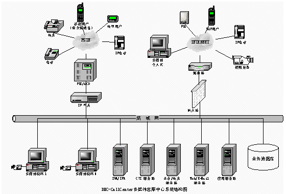 普通電話用戶通過(guò)PSTN接入DHC- UIPS綜合信息平臺(tái)系統(tǒng),接受話務(wù)員服務(wù)或自動(dòng)業(yè)務(wù)流程。傳真用戶進(jìn)入系統(tǒng)可以進(jìn)行傳真業(yè)務(wù)。計(jì)算機(jī)用戶也可以通過(guò)Internet訪問(wèn)企業(yè)客戶服務(wù)系統(tǒng)主頁(yè),獲得服務(wù)。同時(shí)計(jì)算機(jī)用戶也可以通過(guò)Internet利用網(wǎng)絡(luò)電話的功能要求話務(wù)員服務(wù)或自動(dòng)業(yè)務(wù)流程。