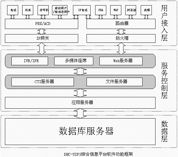 即DHC-UIPS綜合信息平臺(tái)的接入端,包括IVR流程、人工坐席等,它是用戶進(jìn)入多媒體客服中心客服系統(tǒng)的入口,它將直接面對(duì)用戶并收集各種信息。支持電話、傳真、電子郵件、WEB訪問(wèn)、WAP、PDA、IP電話、網(wǎng)絡(luò)電話、視頻電話等多種方式接入。