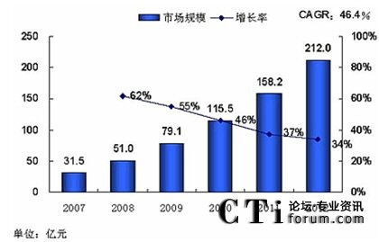 再來(lái)看看統(tǒng)一市場(chǎng)的前景,下圖是某咨詢公司對(duì)國(guó)內(nèi)統(tǒng)一通信市場(chǎng)的預(yù)測(cè)數(shù)據(jù),2012年將達(dá)到212億元,盡管可能存在一定水份,但這么多公司介入這個(gè)市場(chǎng),本身就體現(xiàn)了發(fā)展?jié)摿,這點(diǎn)不容懷疑。