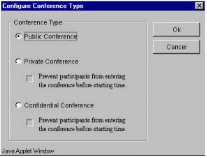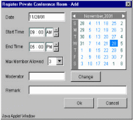 TeleConference系統(tǒng)內的任一個分機,都可以利用瀏覽器(Internet Browser)來預約會議時間,而參加會議的人可以在會議開始時,自動打電話進系統(tǒng)參加會議就像加入“聊天室“一樣簡單。
