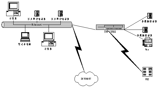 在一個有很多分支機構(gòu)的大企業(yè)的分部安裝Tw-IPBX ,通過IP 網(wǎng)絡(luò)與企業(yè)總部PBX 連接后后,可實現(xiàn)多種應(yīng)用,同時降低了成本。在這種應(yīng)用場景中,采用了基于IP 的傳輸機制(VoIP)。此種情況下VoIP的美好之處在于語音和數(shù)據(jù)的IP 傳輸管路需求(根據(jù)呼叫)的無縫可伸縮性,而無需任何靜態(tài)的分區(qū),這種解決方案可提供性能價格比極高且靈活的網(wǎng)絡(luò)運作。