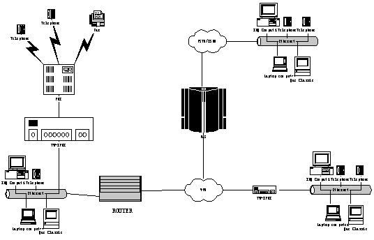 該應(yīng)用示意圖具有一個(iPBX )或多個辦公場地(nIPBX - 組網(wǎng)iPBX )提供電話系統(tǒng)解決方案。該解決方案是基于IP 電話技術(shù)而構(gòu)建的Tw-IPBX “一體化概念”,同時可提供傳統(tǒng)的模擬電話概念,如模擬電話和傳真機。以下敘述了客戶機組合的單獨應(yīng)用場景,包括: