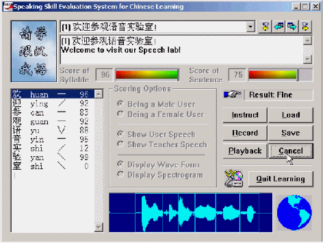 "得意"口語學(xué)習(xí)系統(tǒng)的原理是基于語音音素及其他參數(shù)的提取與分割,將使用者的語音音素系列與標(biāo)準(zhǔn)模型的語音音素序列進行自動比對,并將比對結(jié)果通過視圖形象而直觀地給出,從而對學(xué)習(xí)者的語音給出恰當(dāng)?shù)脑u價(比如對每個音素給出一個得分等),以幫助其改進和提高口語發(fā)音,使其接近或達到語音的標(biāo)準(zhǔn)水平。由于利用可視化的朗讀評分等人機交互的方式,而且通過視覺、聽覺等綜合手段,反復(fù)提示和幫助用戶接近標(biāo)準(zhǔn)發(fā)音,因而顯著提高了學(xué)習(xí)者的學(xué)習(xí)興趣,這對提高英語學(xué)習(xí)成績有很多幫助。