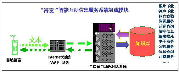 "得意口語對話系統(tǒng)"可以充分滿足互聯(lián)網(wǎng)、短信、WAP等業(yè)務的智能互動信息服務需求,為SP和用戶提供了更易用、好用、實用的信息交流平臺。
