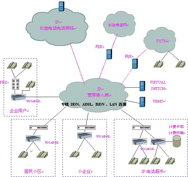 ISP及寬帶網(wǎng)絡(luò)運營商的本地電話接入網(wǎng)絡(luò),采用單級單域結(jié)構(gòu),在網(wǎng)內(nèi)安裝VIRTUALSWITCH虛擬交換系統(tǒng),它作為整個本地電話接入網(wǎng)絡(luò)的網(wǎng)守,以集中方式管理域內(nèi)的所有網(wǎng)關(guān)(VOCA-BOX),執(zhí)行地址翻譯,呼叫控制,帶寬管理,域管理等功能以及呼叫建立、拆除控制和呼叫管理等功能。在網(wǎng)內(nèi)安裝后臺計費、認證系統(tǒng)(VBMS),對各個語音終端實現(xiàn)計費認證及結(jié)算,同時完成號碼分配及網(wǎng)絡(luò)管理的功能。