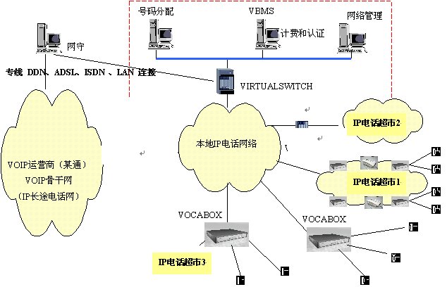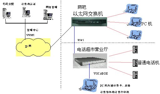 此方案的特點(diǎn)是將電話終端深入到公用電話的超市,用戶可以撥打IP長(zhǎng)途電話、PSTN普通電話用戶及移動(dòng)電話用戶,并在用戶端通過(guò)VOCA-BOX語(yǔ)音網(wǎng)關(guān)、計(jì)費(fèi)卡和計(jì)費(fèi)軟件實(shí)現(xiàn)本地營(yíng)業(yè)廳立即計(jì)費(fèi)的要求。在運(yùn)營(yíng)商的管理中心通過(guò)配置VBMS系統(tǒng)實(shí)現(xiàn)后臺(tái)集中計(jì)費(fèi)認(rèn)證功能,用于管理各個(gè)營(yíng)業(yè)中心的VOCA-BOX語(yǔ)音網(wǎng)關(guān),各營(yíng)業(yè)中心的VOCA-BOX語(yǔ)音網(wǎng)關(guān)提供認(rèn)證計(jì)費(fèi)信息給VBMS,計(jì)費(fèi)類(lèi)型可按實(shí)際的需求配置如:預(yù)付費(fèi)、后付費(fèi)等。此方案可以擴(kuò)大ISP及寬帶網(wǎng)絡(luò)運(yùn)營(yíng)商的業(yè)務(wù)市場(chǎng),增加ISP及寬帶網(wǎng)絡(luò)運(yùn)營(yíng)商的收益。