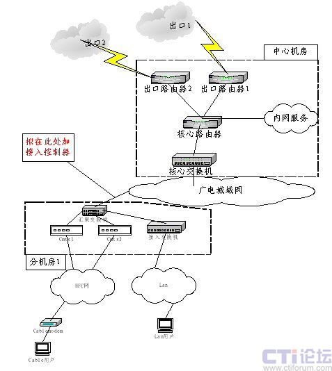 南通廣電目前的IP網(wǎng)絡(luò)拓撲如下圖所示,現(xiàn)有電視塔總前端機房1個;分機房共有4個,每個分機房的情況相同。個人用戶以cable modem用戶為主,用戶通過HFC網(wǎng)絡(luò)接入頭端(cmts),再經(jīng)匯聚交換機接入廣電城域網(wǎng)后經(jīng)電視塔總前端機房訪問internet,新的頭端系統(tǒng)采用Cisco 公司的ubr10012和ubr7246,目前暫決定cable modem和用戶的PC設(shè)備均通過DHCP服務(wù)器(Cisco 的CNR軟件)獲得IP地址;Lan用戶除接入方式不同外,IP地址采用靜態(tài)分配的辦法。目前廣電為部分個人用戶分配公網(wǎng)IP地址,其他個人用戶分配私網(wǎng)地址由出口防火墻通過NAT完成地址轉(zhuǎn)換。