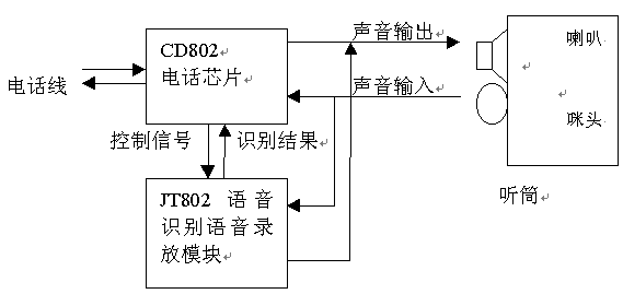 本方案主要由電話機芯片CD802加語音識別錄放模塊JT802構(gòu)成。
