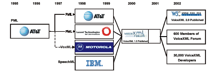 VoiceXML 是由IBM 、Lucent、Motorola 和AT&T 四家公司于2000年提出的一種應用于語音瀏覽的標記語言。如下圖所示,VoiceXML是各廠商多年經(jīng)驗積累的產(chǎn)物,VoiceXML