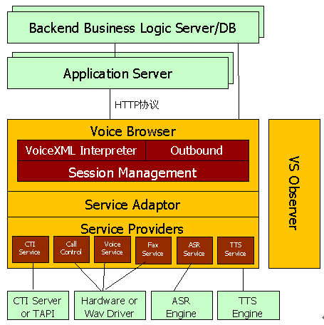用于存放和產(chǎn)生VoiceXML腳本,可以是文件系統(tǒng)或WEB服務器,一般文件系統(tǒng)應用于靜態(tài)腳本,WEB服務器應用于動態(tài)腳本;應用邏輯組件或中間件,進行事務處理。