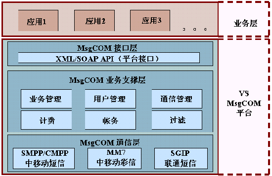 上海聲軟公司(www.voicesoft.com.cn)的MsgCOM通信平臺在國內(nèi)創(chuàng)造性地將業(yè)務(wù)和平臺分開,利用先進(jìn)的XML/SOAP技術(shù)進(jìn)行二次開發(fā)定制業(yè)務(wù)應(yīng)用,以下是它的系統(tǒng)邏輯結(jié)構(gòu)圖: