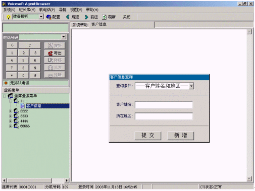 ·語音數(shù)據(jù)同步:當電話轉到該座席上時,業(yè)務界面中將根據(jù)用戶的電話號碼以及操作信息,提示座席客戶資料