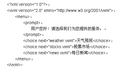 下面是一個VoiceXML的簡單例子。當用戶與電話語音系統(tǒng)接通以后,將會聽到語音合成的提示信息"用戶您好!請選擇我們?yōu)槟峁┑姆⻊眨?。當用戶說"股票市場",語音瀏覽器就會通過語音識別功能識別用戶的選擇,然后把對話流程轉向另一個VoiceXML腳本文件stocks.vxml。stocks.vxml腳本文件則是一個專門向用戶提供股票市場相關服務的語音網(wǎng)頁。
