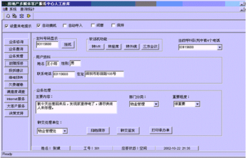 。。接通呼叫中心的電話后,按語音提示選擇相應(yīng)的服務(wù),選擇相應(yīng)的服務(wù)功能鍵后,在服務(wù)人員的計算機(jī)屏幕上自動彈出對話框顯示用戶的詳細(xì)信息。