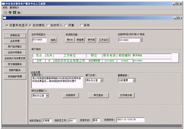 企業(yè)或個(gè)人打入電話后,可以選擇人工服務(wù),同座席話務(wù)人員直接溝通,由話務(wù)人員將企業(yè)或個(gè)人反映的問(wèn)題和提出的建議意見(jiàn)記錄下來(lái),并同時(shí)記錄下該客戶的聯(lián)系方式,將相關(guān)數(shù)據(jù)添加入系統(tǒng)數(shù)據(jù)庫(kù);也可以在數(shù)據(jù)庫(kù)的支持下回答企業(yè)或個(gè)人對(duì)科技成果和政策法規(guī)的咨詢和疑問(wèn)。企業(yè)或個(gè)人也可以選擇自動(dòng)語(yǔ)音服務(wù)方式,根據(jù)系統(tǒng)的語(yǔ)音提示輸入按鍵,選擇類別,將自己的投訴和建議以及自己的聯(lián)系方式信息以留言錄音的方式保存在系統(tǒng)中。系統(tǒng)同時(shí)還支持自動(dòng)傳真方式,企業(yè)或個(gè)人可以通過(guò)傳真機(jī)打通客戶服務(wù)中心,通過(guò)按鍵選擇傳真方式,將自己的意見(jiàn)建議等的文本內(nèi)容傳真給系統(tǒng),系統(tǒng)自動(dòng)接受并存入數(shù)據(jù)庫(kù)。