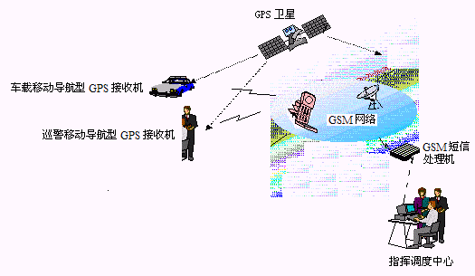 巡警利用移動終端(帶手機(jī)通信功能的GPS接收機(jī))發(fā)出報警信號,通過GSM系統(tǒng)送到指揮調(diào)度中心。
