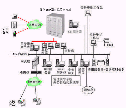 勞動(dòng)局多媒體呼叫中心系統(tǒng)主要是由智能型可編程交換機(jī)或帶語(yǔ)音板卡的工控機(jī)或排隊(duì)交換機(jī)、CTI服務(wù)器、IVR(交互式語(yǔ)音應(yīng)答)/IFR(交互式傳真應(yīng)答)子系統(tǒng)、人工座席子系統(tǒng)、應(yīng)用服務(wù)器、數(shù)據(jù)庫(kù)服務(wù)器、業(yè)務(wù)網(wǎng)關(guān)子系統(tǒng)、WEB服務(wù)器、電子郵件服務(wù)器、防火墻、通信網(wǎng)關(guān)等硬件設(shè)備和應(yīng)用軟件組成。