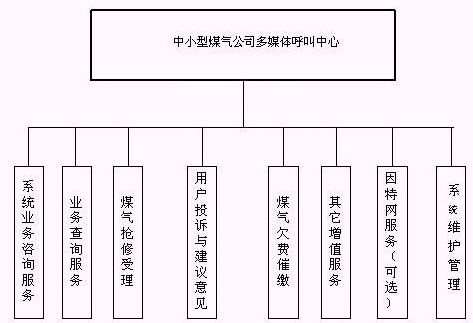 客戶利用電話、手機等撥打某一特服號碼(如9xxxx)進入中小型煤氣公司多媒體呼叫中心系統,本系統依托煤氣公司各類業(yè)務技術支持系統和網絡系統,通過人工受理或自動語音服務等方式全天24小時不間斷地為客戶提供各種服務。