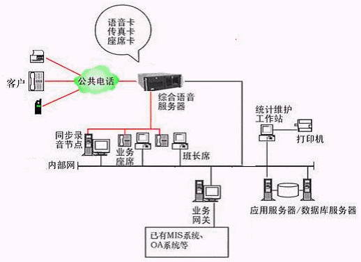 本系統物理結構由帶語音板卡的高性能工控機(稱為綜合語音服務器,在功能上可以分為CTI服務器、IVR(交互式語音應答)/IFR服務器、統計維護管理工作站、數據庫/應用服務器、錄音留言工作站、業(yè)務網關服務器、業(yè)務代表座席、網絡系統等和應用軟件構成。