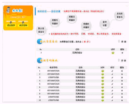 - "彩話DIY"服務(wù):通過IVR自己錄制BGM素材或通過因特網(wǎng)上傳BGM素材;