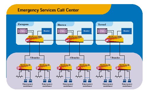 在阿拉貢地區(qū)撥打112可以接通Zaragoza、Huesca或Teruel三地的最近的呼叫中心。在接線員點擊電子地圖上呼叫方所在位置后,呼叫便通過MAXcess設(shè)備自動路由到離呼叫方最近的分支機(jī)構(gòu)的專用電話上。接下來,該分支機(jī)構(gòu)便立即派出緊急救護(hù)車。接線員輸入到系統(tǒng)中的有關(guān)事件的信息也可以通過LAN立即到達(dá)遠(yuǎn)端MAXcess。