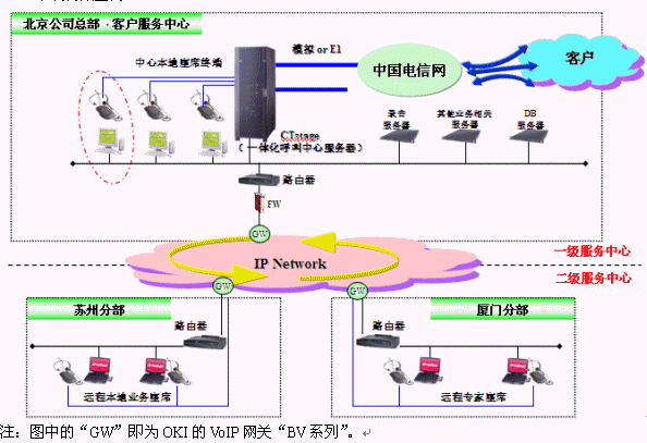 另一方面,OKI則擁有構(gòu)筑大規(guī)模IP電話的豐富經(jīng)驗,從最初的窄帶網(wǎng)絡(luò)到最近的寬帶網(wǎng)絡(luò),OKI一直在提供著最適合使用用戶環(huán)境的、追求音質(zhì)的VoIP產(chǎn)品。伴隨著寬帶網(wǎng)絡(luò)在企業(yè)市場中日益深入的運用,及呼叫中心市場中呈現(xiàn)的最新需求,OKI充分將IP技術(shù)運用到呼叫中心系統(tǒng)中,推出IP型分散客服中心解決方案。所謂分散型系統(tǒng),是指用網(wǎng)絡(luò)將分散在各個點的多個呼叫中心連接起來,作為一個大規(guī)模中心統(tǒng)一運用的系統(tǒng)。