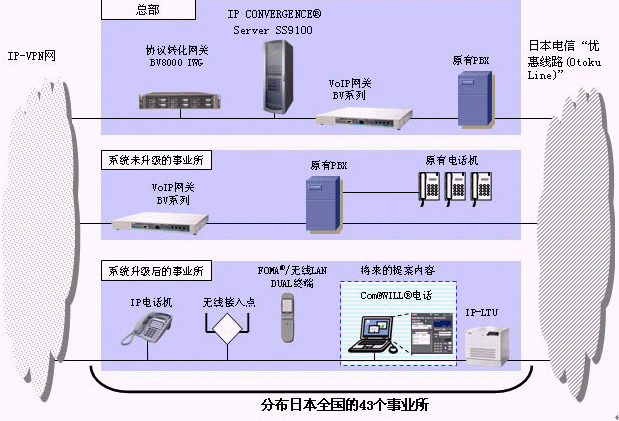 CONVERGENCE® Server SS9100(以下簡稱SS9100)"為基礎(chǔ)的IP Centrex系統(tǒng)(注1)。預(yù)計(jì)在2007年構(gòu)筑完成連接其分布日本全國各地的43個(gè)事業(yè)所的企業(yè)內(nèi)部IP