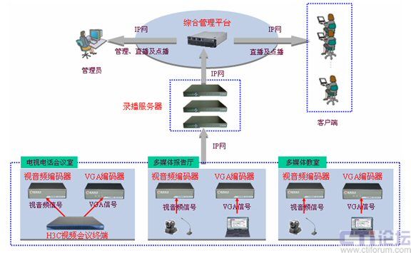 對于學(xué)校經(jīng)常進行學(xué)術(shù)報告的錄播,可以將多媒體報告廳的視頻和音頻輸入到視音頻編碼器上,將電腦的VGA輸入到VGA編碼器上,視音頻編碼器和VGA編碼器可以將接入的信號進行編碼,通過網(wǎng)絡(luò)傳給錄播服務(wù)器進行信號處理、整合,最終傳輸?shù)骄C合管理平臺上。