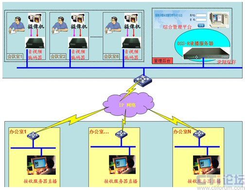 基于上述的需求,經(jīng)過調(diào)研選用深圳銳取錄播服務(wù)器產(chǎn)品完成上述的功能需求。如圖所示,通過放置在每個會議室考場內(nèi)的攝像機,將竟聘者的圖像與聲音傳輸?shù)较噙B接的銳取公司的視音頻編碼器上,通過編碼器的編碼將采集的信號(通過內(nèi)部網(wǎng)絡(luò))傳輸?shù)胶笈_的管理平臺上的DSS-R錄播服務(wù)器中。服務(wù)器的直播模塊將從音視頻編碼器接收到的信號分發(fā)到網(wǎng)絡(luò)中,每個接入內(nèi)網(wǎng)絡(luò)的辦公室內(nèi)里的電腦通過專有客戶端接收考場實時內(nèi)容,實現(xiàn)了真正意義上的接受機關(guān)廣大干部群眾的監(jiān)督考察。同時錄播服務(wù)器內(nèi)置的錄制模塊,將收到的信號內(nèi)容解碼錄制保存(服務(wù)器內(nèi)有可供存儲的硬盤),為日后干部的選擇做到了有理可依,有據(jù)可查。